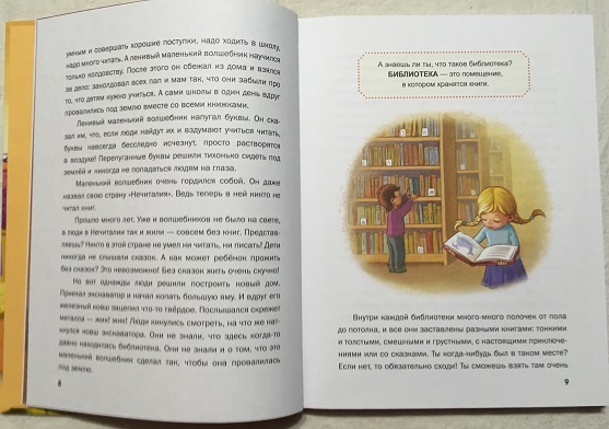 Могу сказать однозначно - книга очень понравилась будущей первокласснице. Можно читать лет с 5-ти, когда учите буквы и начинаете читать. История такая - маленький злой ленивый волшебник не хотел учиться и заколдовал все буквы, они исчезли вместе с книгами. И поколение людей выросло, не умея читать. Но однажды люди откопали старую библиотеку, и нашелся мальчик, которого бабушка научила грамоте. И вот этот мальчик с отрядом детей ищет по всему свету пропавшие буквы, сочиняет для них стишки и учит детей читать.) Читается книга легко, в тексте есть небольшие слоги и слова крупным шрифтом для самостоятельного чтения ребенка. Также даны толкования некоторых понятий. Например, что такое библиотека. К книге прилагался диск, но он у нас оказался нерабочим.