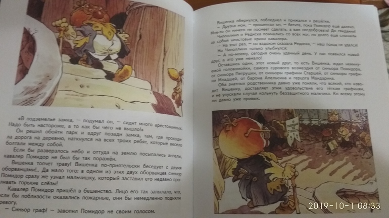 Я не люблю Чиполлино. Купила его, так как отнесла его к детской классике, ну, а иллюстрации Мигунова и хорошее качество книги сделали своё дело. Сама я когда-то пыталась читать эту книгу сыну, но ни у меня, ни у Владика книга особого желания читать/слушать не вызвала. Так и лежала она полке. Но потом появилась аудиокнига Чиполлино. Аудиокниги скачивает сыну муж, ведь я бы могла и упустить это произведение. И вот в конце августа, когда Владик пошел искать на книжных полках чтобы почитать, он выбрал сказку про луковицу))). Книга толстая, но начал он ее читать в конце августа, и в первые дни сентября, когда еще учеба не забрала столько времени, он ее дочитал. Ему понравилось, вспоминал песенки из аудиокниги, рассказывал понравившиеся моменты.