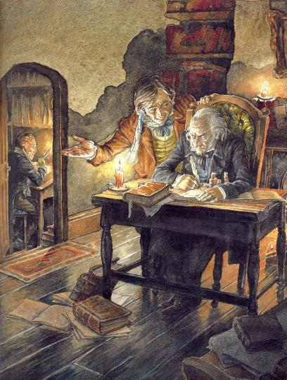 Дух обратил к Скруджу кроткий взгляд. Его лёгкое прикосновение, сколь ни было оно мимолётно и невесомо, разбудило какие-то чувства в груди старого Скруджа. Ему чудилось, что на него повеяло тысячью запахов, и каждый запах будил тысячи воспоминаний о давным-давно забытых думах, стремлениях, радостях, надеждах.