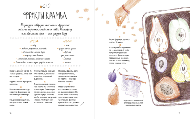 В книге четыре главы - "Осень", "Зима", "Весна" и "Лето". В каждой из них свои сезонные продукты, которые в это время в самом соку. Ребенок научится готовить черничный пирог, банановый хлеб, ленивые вареники, грибной суп, тыквенные вафли и многое другое. Авторы уверены, что дети могут готовить с азартом, экспериментировать и придумывайте свои рецепты не хуже взрослых.