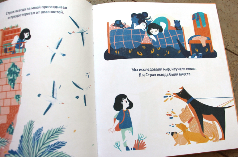 Слов в книге мало, но много иллюстраций. Эти иллюстрации и создают ассоциации, а текст поясняет какие они. Я читала сыновьям 4 и 8 лет и во время чтения текста прямо вела пальцем по картинкам. Картинки нарисованы как цепь событий - на одной странице может быть сразу несколько этапов страха и детям (даже школьнику) надо помочь правильно посмотреть на них. А потом можно еще спросить или пояснить. Это как инструкция к действию. Вы же не просто читаете ребенку инструкцию к игрушечному роботу, а сначала сами нажимаете на кнопки.