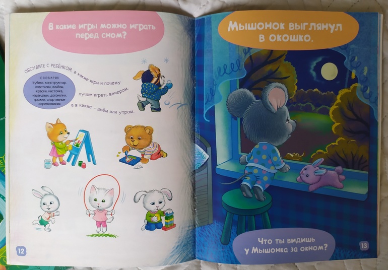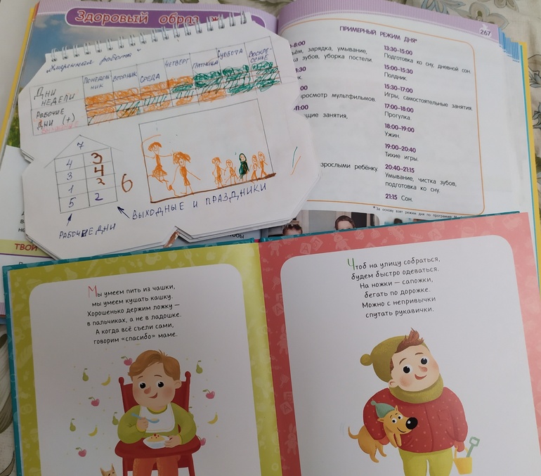 И вопросам безопасности уделяем внимание: убираем все игрушки перед сном на свои места и с кроватей (поэтому в вечернем ритуале на картинке режима фигурирует кровать), ночью вместо перекрещенных рук (из книги Г. Остера) дети используют фонарики🙂
