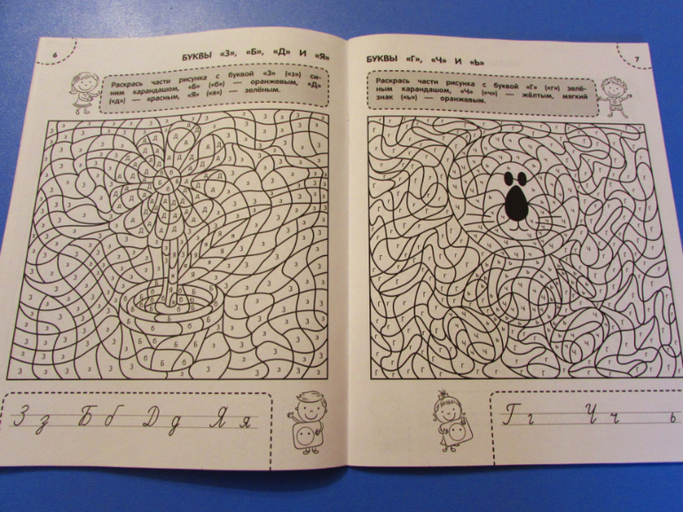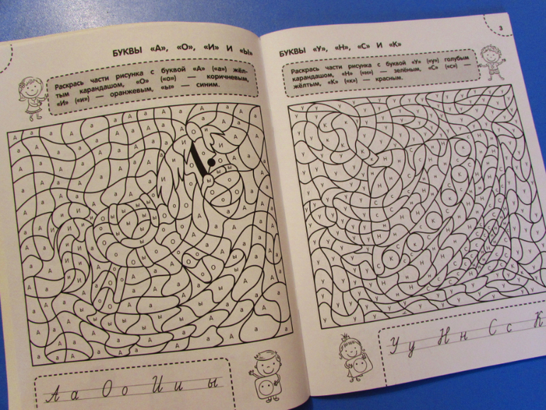 Например в первом задании надо раскрасить рисунок. Где каждая буква (А, О. И, Ы) - красится в определенный цвет.