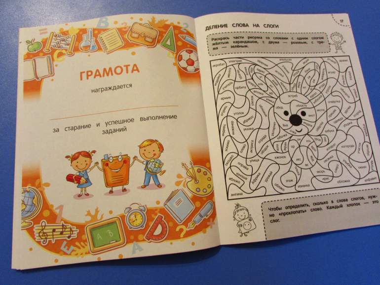 Плюс на этом же развороте размещена грамота, которую предлагается выдать ребенку после прохождения всех заданий.
