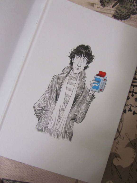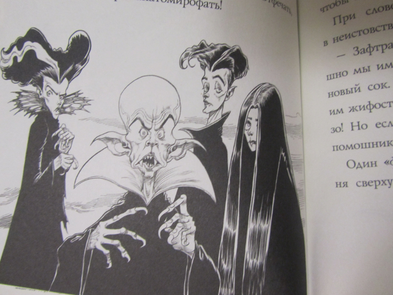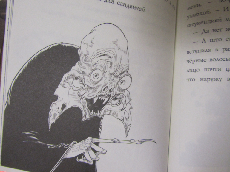 В общем в поисках книг, которые могли бы заинтересовать мою дочку, наткнулась на эту, Гейману я лично симпатизирую, а тут вроде и текста на странице немного и рисунки на каждой странице и тема интересная и не малышковая. В общем дочка сначала загорелась, а потом всё чтение сошло на нет, говорит много непонятных слов, и она часто не понимает смысла происходящего. Да, действительно слова непонятные есть, сама история казалось бы простая - дома закончилось молоко, папа пошел в магазин его купить (я почему то сразу вспоминаю дочкину любимую Тосю-Босю, где папа всегда в магазин за молоком уходил, когда девочку надо было за что-нибудь пожурить) и тут с ним начинают происходить всякие странные события, сначала он попадает на борт летающей тарелки, потом на пиратский корабль.. Да, многие могут подумать, что это бред полный, но у Геймана стиль такой, именно это мне казалось привлечет дочку - много всяких невероятных событий, но дочитывать скорее всего книгу будем позже, годика через два-три. Иллюстрации в книге Криса Ридделла, очень прикольные на мой взгляд, но много всяких монстров в книге есть ( вампиры, например).