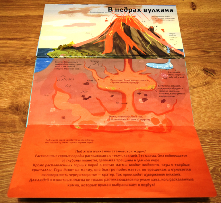...Или узнать про что-то новое. В "Над землёй и под землёй" нравится простота и схематичность представленных тем. В этот раз говорили про вулканы и джунгли. Четырёхлетнему ребёнку информации для удовлетворения интереса хватило.