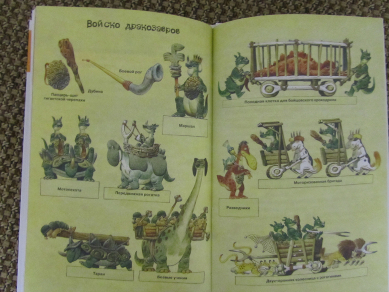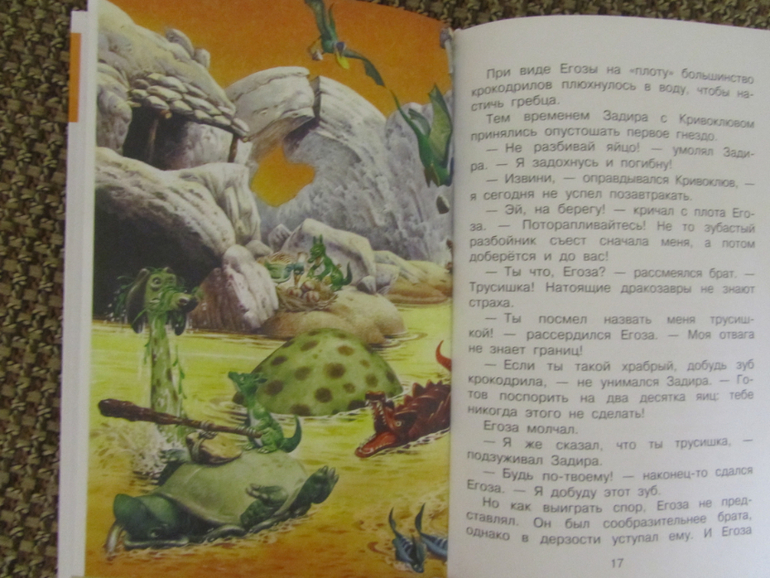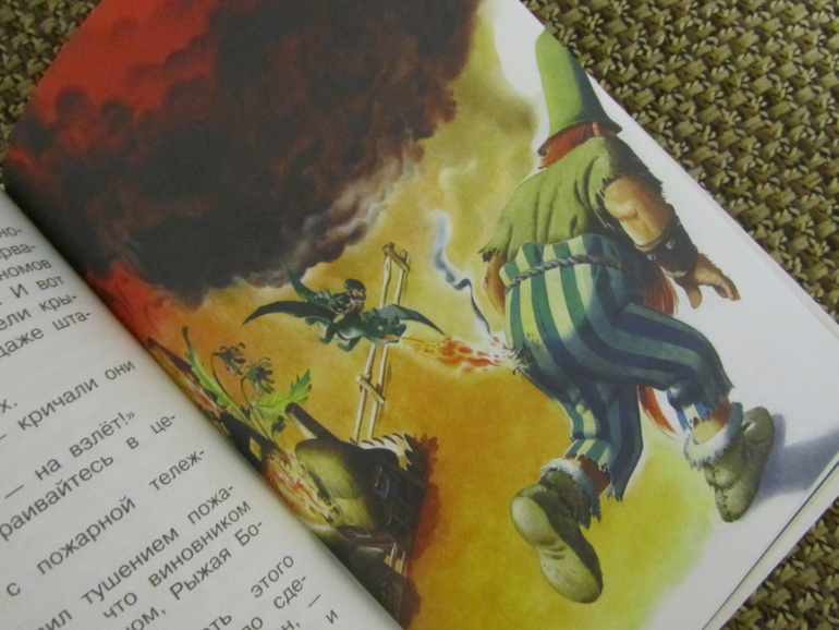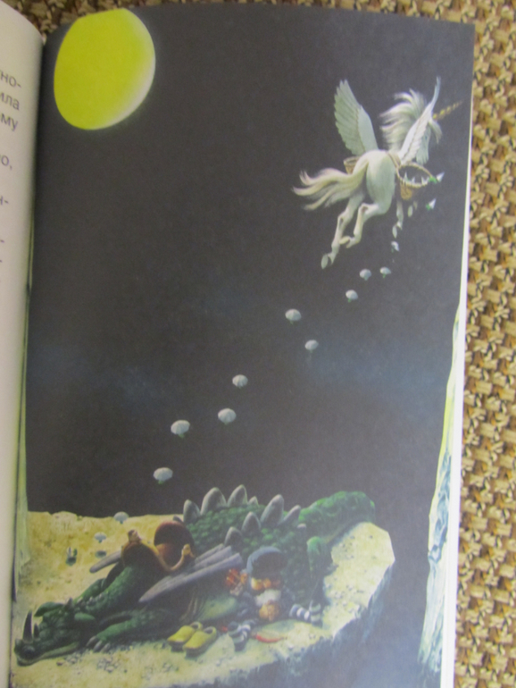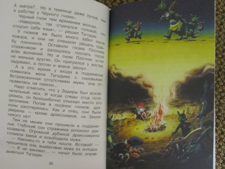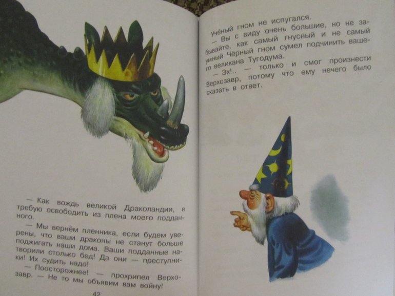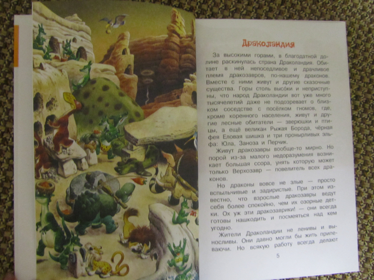 Книжечка эта не только с иллюстрациями одного из самых детских на мой взгляд художников, но и за его же авторством. Обычно я с опаской отношусь к тому, что иллюстраторы начинают сами писать книги, хотя есть и удачные варианты, как например у Ломаева с его колыбельной))) Именно поэтому я сильно сомневалась над покупкой, но всё таки эти дракончики и гномики меня покорили)) Сыну тоже книга очень понравилась, обычно он не очень любит толстые книги, которые надо читать с продолжением несколько вечеров, а эту прям сам ждал, когда продолжим...Сюжет незамысловатый - из-за пустякового конфликта спровоцированного одним злым черным гномом два соседствующих клана драконов и гномов оказались на пороге войны, и всё могло бы обернутся печально, если бы старейшины кланов не придумали другой более мирный путь урегулирования конфликта и всё закончилось хорошо) А иллюстрации в книге просто чудо, на каждой странице, хотя всё таки мне кажется АСТ немного намудрило с цветопередачей, темноваты, в оригинале они скорее всего светлее и четче. Учитывая цену книги, это очень удачное у нас приобретение))