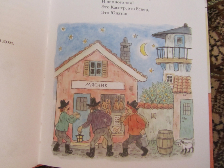 А ещё-ещё в городе ездит трамвайчик,в котором не только не надо платить, но даже каждому пассажиру выдают пряники с кардамоном -эх, вот бы у нас так!!! ( И для справки : Кардамо́н - плоды многолетнего травянистого растения Кардамон настоящий семейства Имбирные). А лев живет вместе с тремя разбойниками, которые частенько по ночам наведываются в этот славный городок, чтобы украсть себе и очень прожорливому льву еды )) Зато из-за этого льва разбойников боятся и не трогают, хотя все знают, кто крадёт еду и где они живут! А разбойники эти скажу я вам очень даже скромные, крадут только для пропитания: "Один мешок набьём добром, а больше нам не нужно."