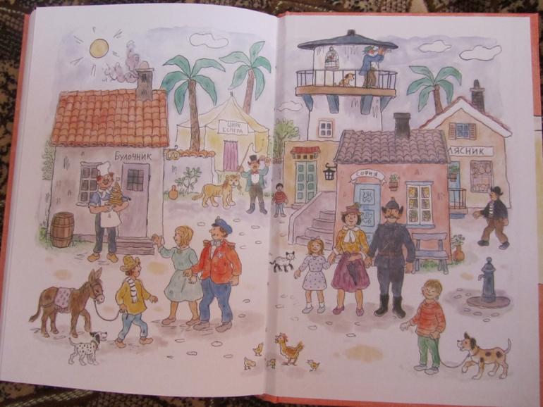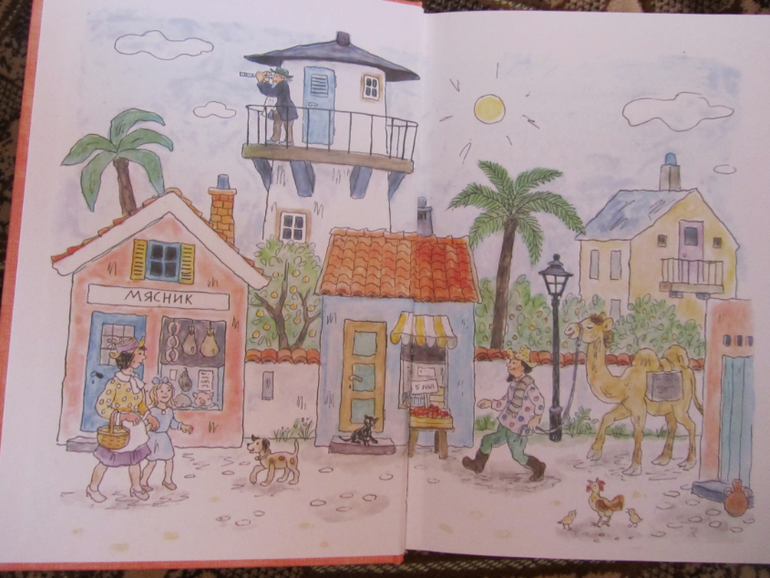 А вот это просто отличнейшая книга! Вот такой чудный форзац у книги с жителями славного городка Кардамона, в котором живут не только кошечки и собачки вместе с людьми, но и говорящий верблюд, и даже лев-разбойник!