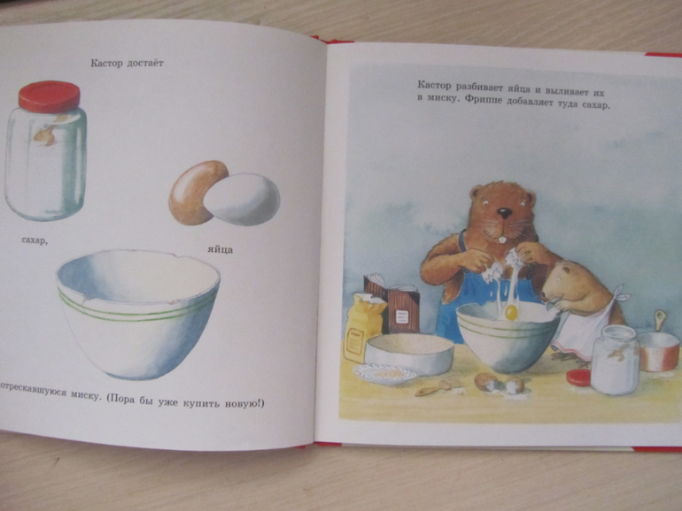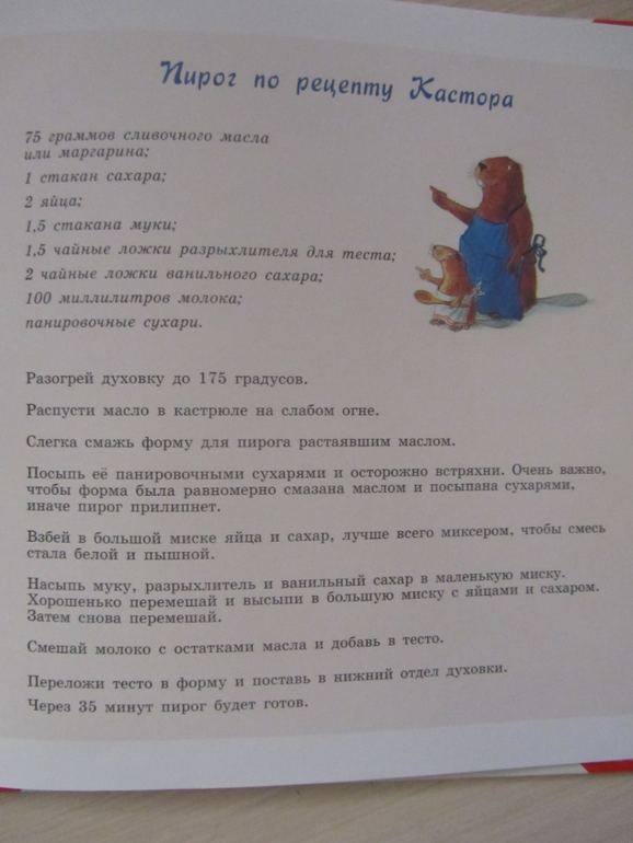 Эта книга одна из самых любимых у сына и я была уверена, что тысячу раз о ней писала уже, но пролистав наши дневники чтения не увидела отзыва о ней, исправляюсь. Да конечно Кастора мы читали лет с трех и с дочкой и сыном, но вот же приносит до сих пор)) И кроме истории про пирог разумеется в фаворитах у сына про мастерскую и велосипед, вот про них как раз я рассказывала, а пирог остался обделенным. Хотя и на первый взгляд история девочковая, но ведь пирог в книге готовят мальчики, поэтому видимо сын любит эту историю)) Хотя вот фартук тоже мальчик себе шьет, а сын ту историю вообще никогда не берет с полки. Иллюстрации в пастельных тонах, очень приятные, ведь в книге по сути написано просто процесс приготовления пирога и всё, никаких тебе приключений и тому подобное, но всё равно сидишь и с удовольствием каждый раз читаешь ))
