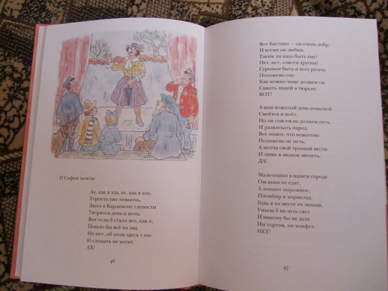 Ну и наверное самое примечательное, что есть в этой книжке - это песни и их в книге мноооого! В Кардамоне поют все и в городе есть даже свой оркестр! Я конечно тот ещё певец, но а что делать - конечно пела )) И конечно эти песни очень украшают книгу и делают её ещё более необычной)) Дочке эту книгу тоже читала в пять лет, она была в восторге и от книги и от песен, а вот сын к книге отнесся более прохладно, хотя тут и тема разбойников и лев колоритный, что больше мне кажется мальчуковая тема, но как я уже упоминала сын пока не очень жалует толстые книги с продолжением, ему каждый вечер подавай новую)), может быть в этом причина,что с неохотой соглашался слушать эту книгу по вечерам, тем не менее книга хорошая, рекомендую. У нас ещё Вертихвост есть, сыну ещё не читала, посмотрю позже как она пойдет..