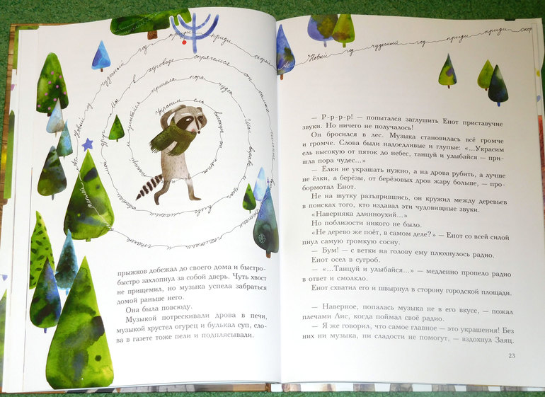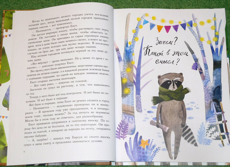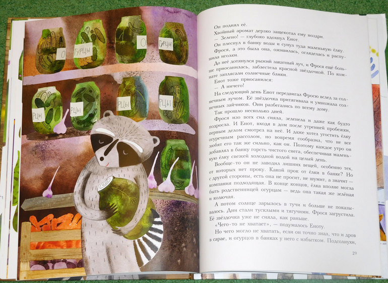 Как обычно, проиллюстрировала сказку сам автор. И я сразу же выскажусь по поводу рисунков, которые нам нравятся, но... Книгу я заказала сразу, не присматриваясь, как только она появилась в магазине. И уже получив книгу, очень удивилась, для чего на обложку поместили такого хмурого енота. Если бы я не знала автора, если бы искала в обычном магазине какую-нибудь детскую книгу, то этого угрюмого енота обошла бы стороной. Конечно, это лично моё впечатление. Поэтому хочу спросить вас - а как вам эта обложка?