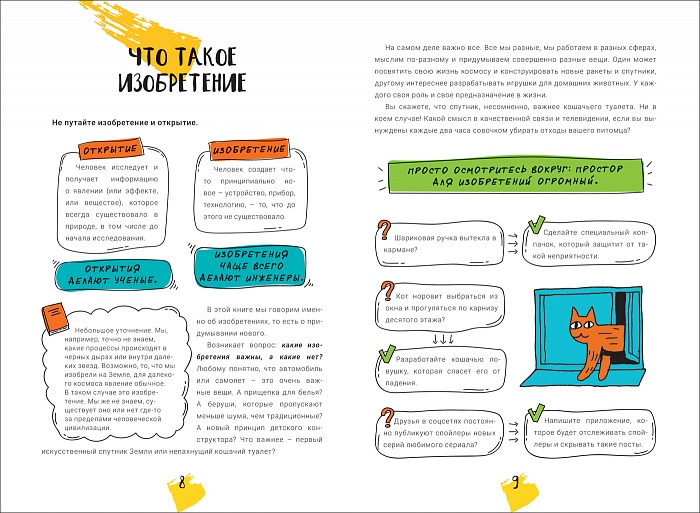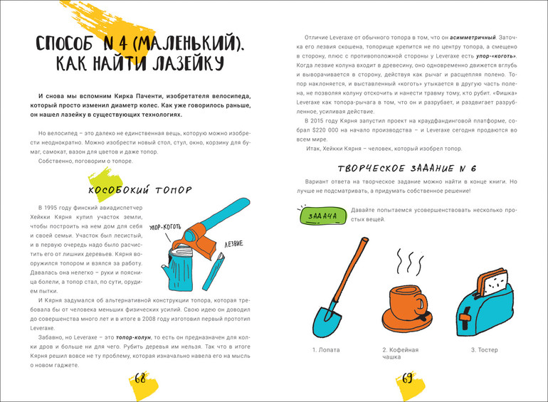 Книга Тима Скоренко «Думай и изобретай» основана на его лекциях «Как стать изобретателем?», которые Тим читает для слушателей от 6 лет и старше. В книге есть огромное количество примеров с историями тех или иных изобретений, что невероятно вдохновляет на собственные поиски решений самых разнообразных проблем. А чтобы «раскачаться», можно выполнить творческие задания (и потом сравнить свои ответы с приведенными в конце книги).