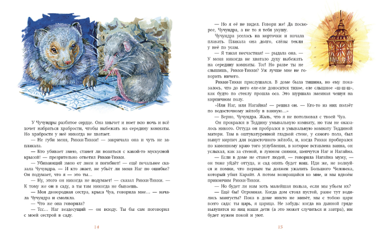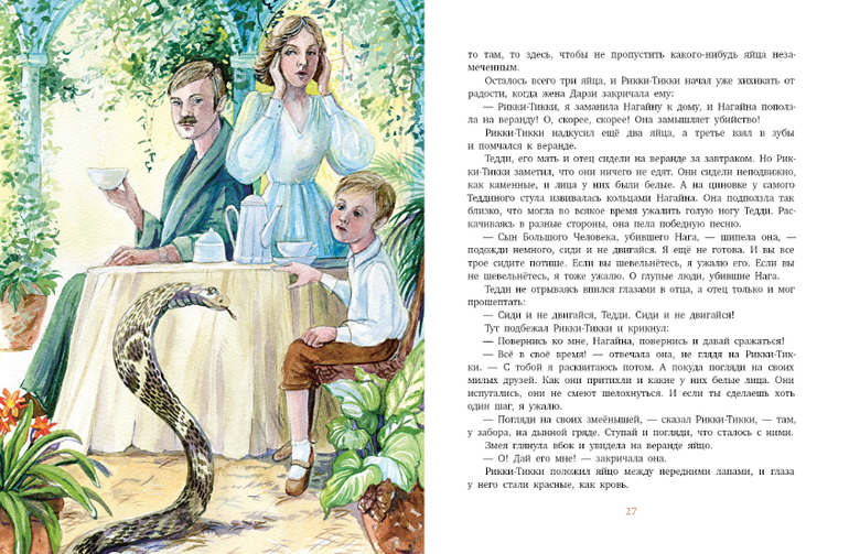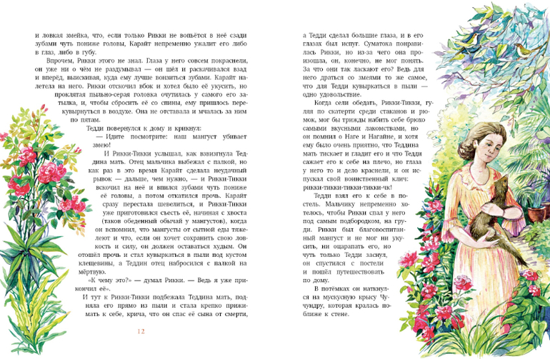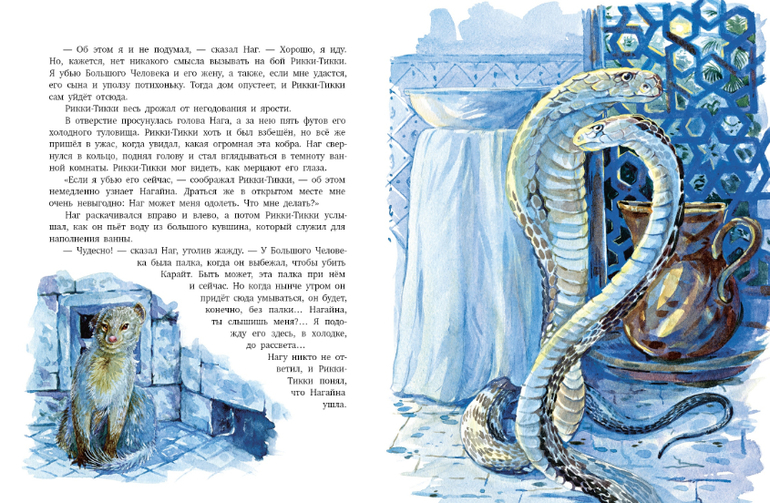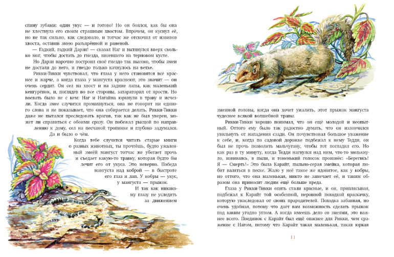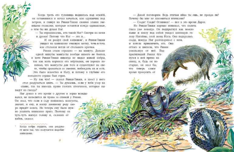 Это сказка о великой войне, которую вел совсем ещё молодой мангуст Рикки-Тикки-Тави с двумя кобрами Нагом и Нагайной. Дарзи, птица-портной, помогала ему, а Чучундра, мускусная крыса - давала ему советы. Но по-настоящему воевал он один. Рикки-Тикки-Тави во время наводнения вынесло потоком реки на берег, где его нашел мальчик Тедди. Мальчик и его родители взяли мангуста в дом, и он стал лучшим другом и защитником людей от кобр. Известно, что где поселился мангуст кобрам не место! Рикки-Тикки-Тави хорошо понимал, что мангусты для того и существуют на свете, чтобы сражаться со змеями и побеждать их!