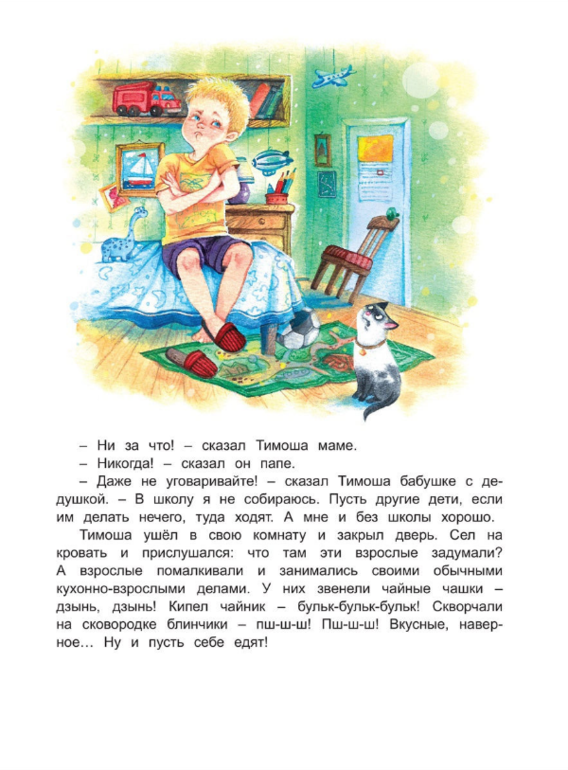 Скоро в школу? Страшно? Вот и Тимоша первого класса испугался… Ни комнаты с игрушками, ни детского сада, ни даже маленького кустика дачной малины - ничего привычного и родного в школе не будет! Может быть, пусть лучше бабушка в первый класс пойдёт? Она, кстати, и не возражает. Купим ей разноцветных тетрадок, красок и фломастеров, а ещё лучший в мире школьный космический рюкзак! Но как же Тимоша? Вот-вот наступит День знаний, и все его друзья пойдут учиться…