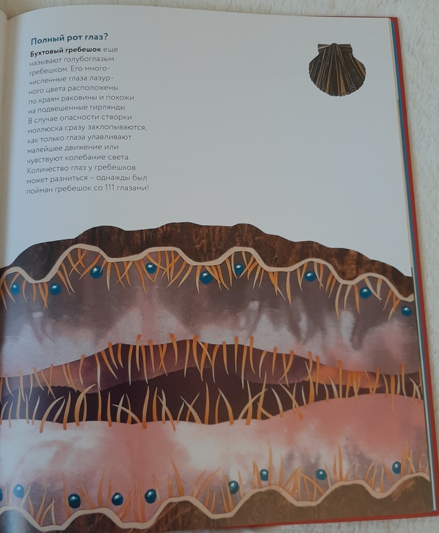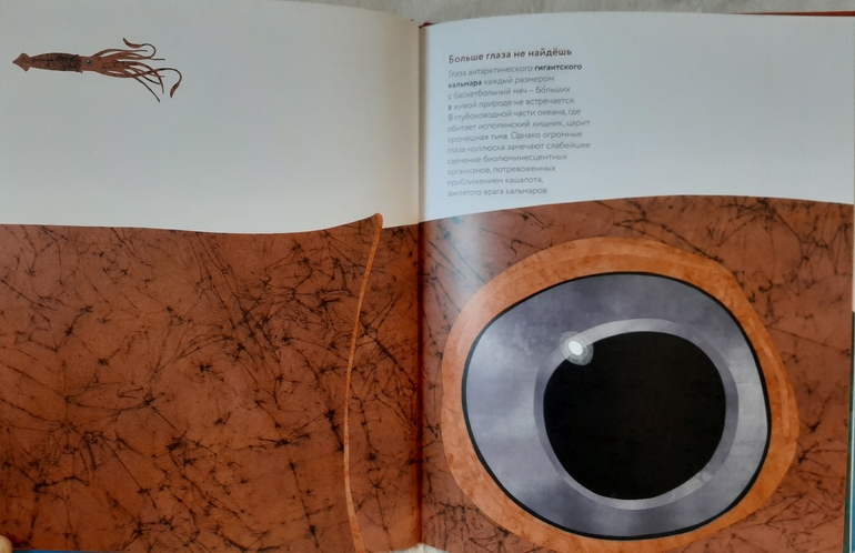 У гигантского кальмара глазик размером с баскетбольный мяч! Я вот сразу задумалась, а какого тогда размер он сам то?! И не пришлось лесть в интернет, для таких любопытных в конце книги есть краткие характеристики представленных живых организмов)