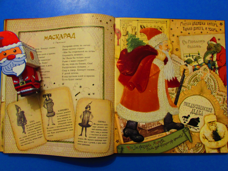 А тут только открываешь книгу и сразу видишь кармашек с подарками: с маской, картонными елочными игрушками.