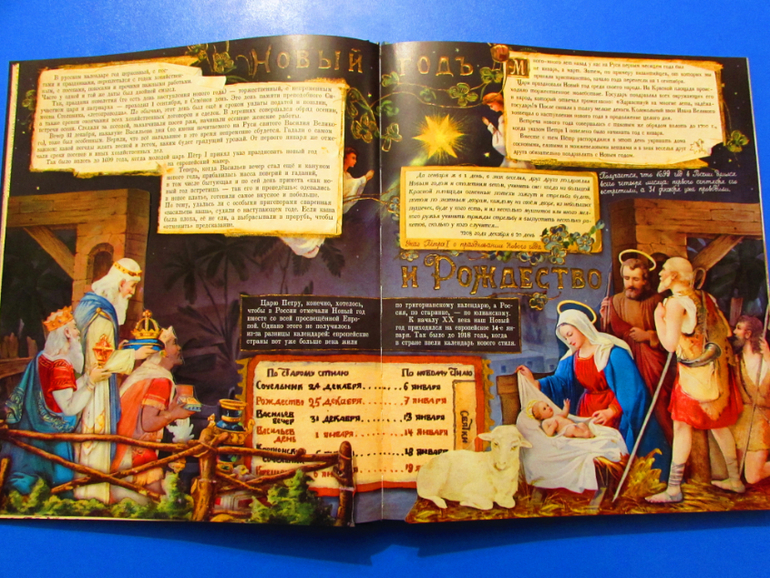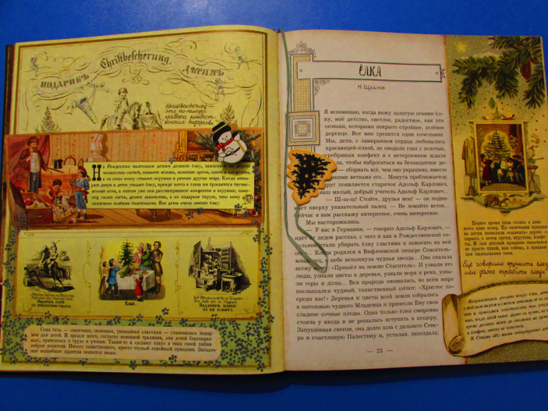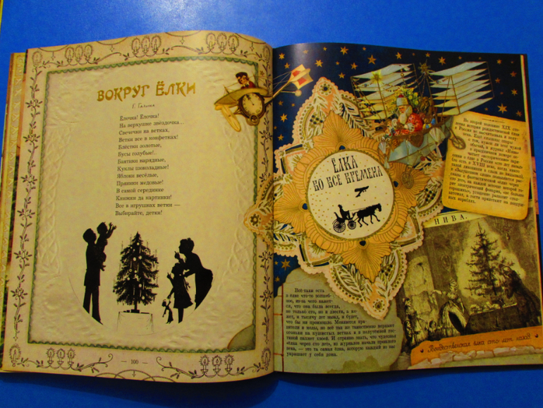 В ней есть все: рассказы, стихи, сказки, открытки, детские поделки из старинных журналов, рецепты новогодних блюд, история новогодних традиций, идеи украшения елки и пр.