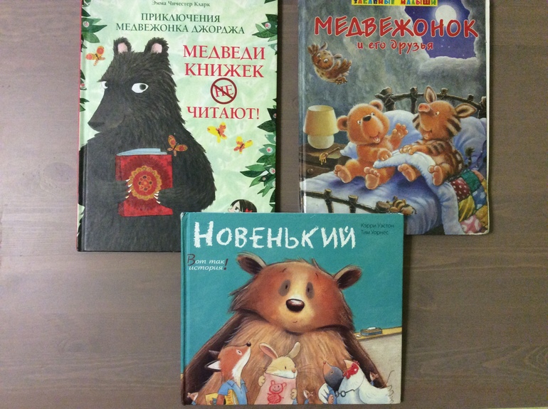 На фотографии подборка библиотечных книг про медведей. Пожалуй, из всех чаще всего читали только историю о том, как порой бывает нелегко вливаться в новый коллектив.