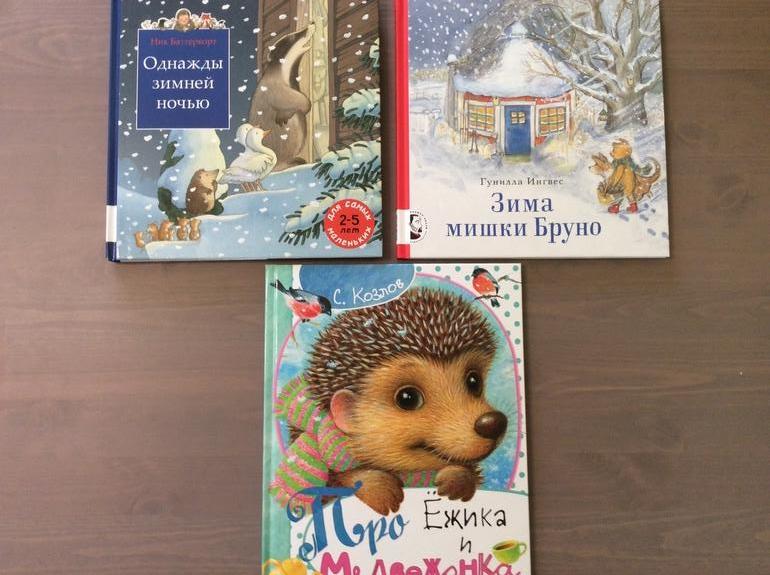 На этой фотографии - ещё три любимчика среди зимних книг. Истории про дядю Вилли и обитателей парка не раз заставляли Илюшу посмеяться, а благодаря мишке Бруно у него проснулся интерес к изучению следов на снегу во время зимних прогулок по лесу и паркам. Сказки Козлова про Ежика и Медвежонка вроде бы такие немного странноватые, но в то же время, очень милые и согревающие. Иллюстрации в книге отличные.