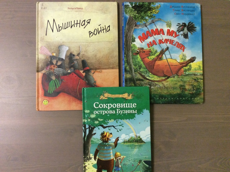 В очередной наш поход в библиотеку удалось найти продолжение серии историй про Лакомку и Рыцаря, сын часто подхихикивал на разных забавных моментах. Впервые прочитали книгу из серии про корову Маму Му, слушал тоже благосклонно. А вот смысл «Мышиной войны», как мне кажется, Илюша не уловил.
