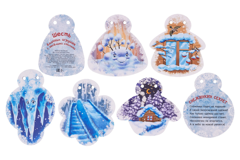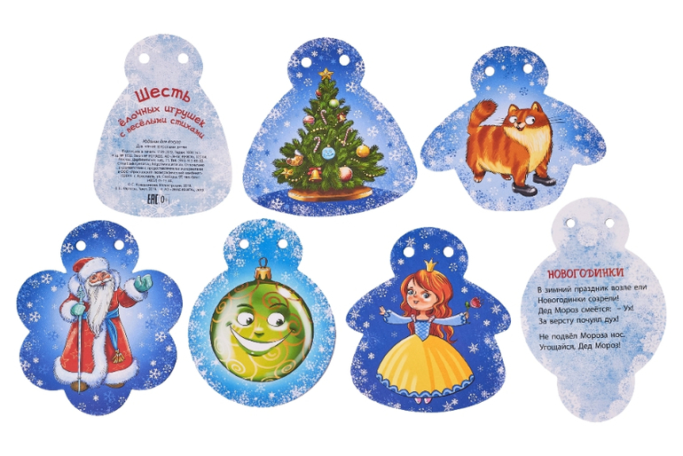 Это 12 плотных картонных карточек. На одной стороне - веселый новогодний стишок, на другой - яркая картинка. Каждая картонка легко превращается в елочную игрушку - красивую, легкую и небьющуюся.