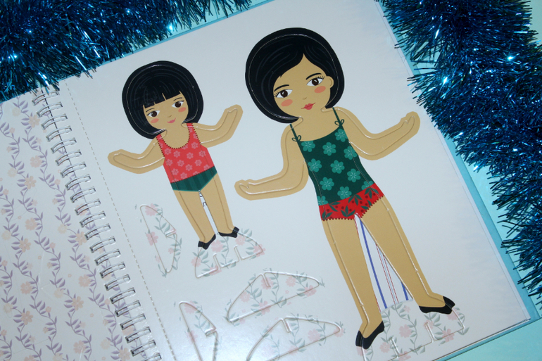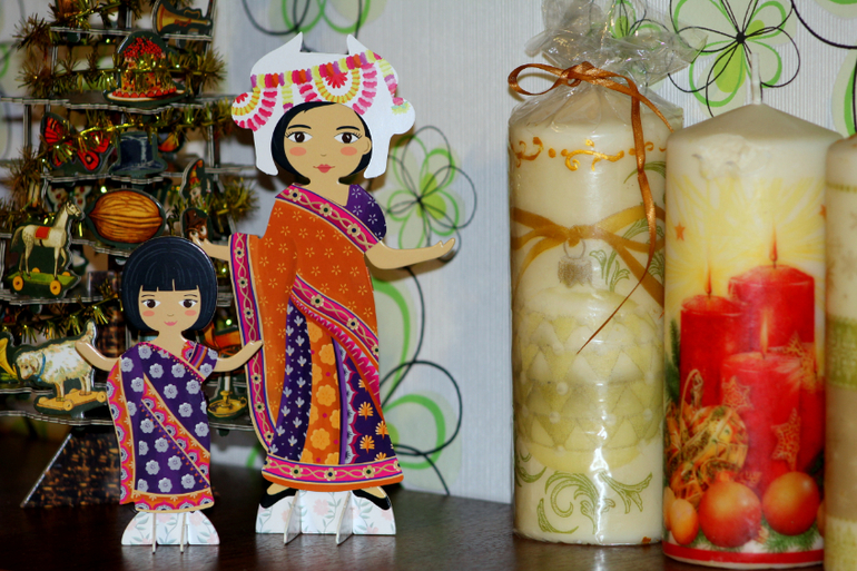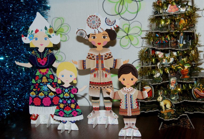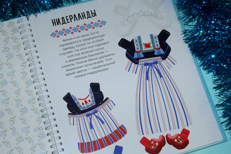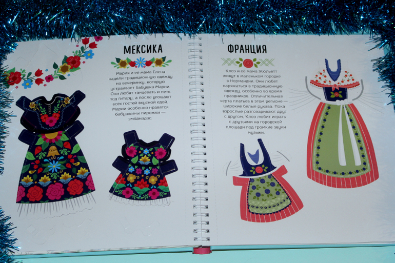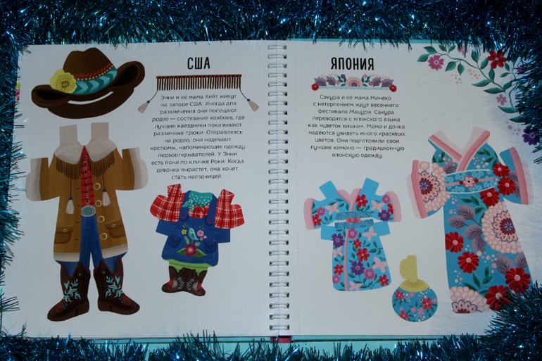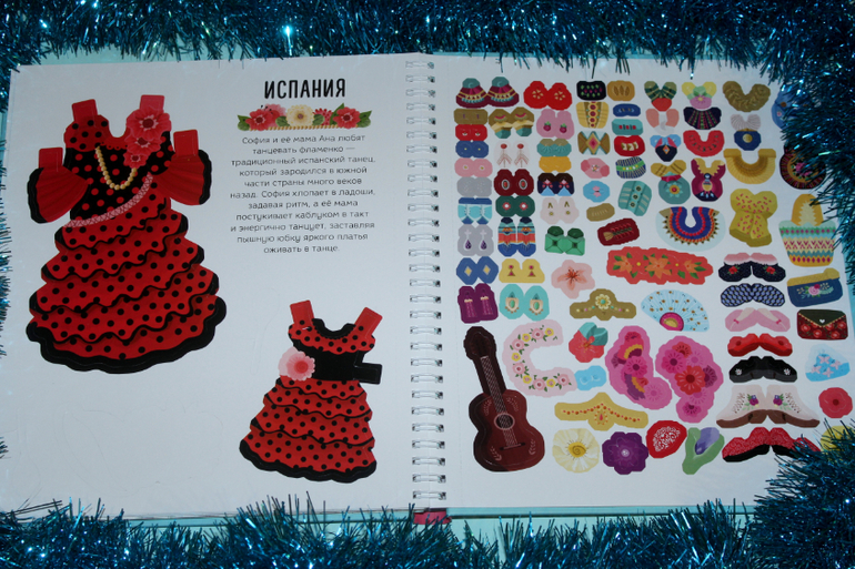 В книге вы найдёте восемь куколок из очень плотного картона. Четыре мамочки у каждой по дочке.)) Все куклы разных национальностей. Так их удобнее переодевать. Нарядов в книге огромное количество и все они представляют национальную одежду разных стран. Продумана каждая мелочь! Для кукол есть подставочки, их не нужно придерживать, чтобы играть! У нас они водят хоровод вокруг ёлочки, а Настёна переодевает их каждый день в новые костюмы, бывает и несколько раз в день куколки меняют одежду.)) Вместе с нарядом куклы меняют и свои имена и национальность. В книге написаны имена и немного информации о том, куда собралась девочка с мамой, зачем они одели такой наряд. И даже когда все одёжки будут вынуты из книги и храниться будут в коробочке, или конвертике, можно не переживать, что не сможете запомнить какой наряд к какой стране принадлежит. В самом конце книги есть карта с названием стран и нарисованным нарядом! Отличное, продуманное решение издательства! Настёна ещё радуется наклейкам.)) А как же! Куклам можно и сумку в руки дать, и украсить серьгами и браслетами! Одним словом красотища! Мечта любой девочки!