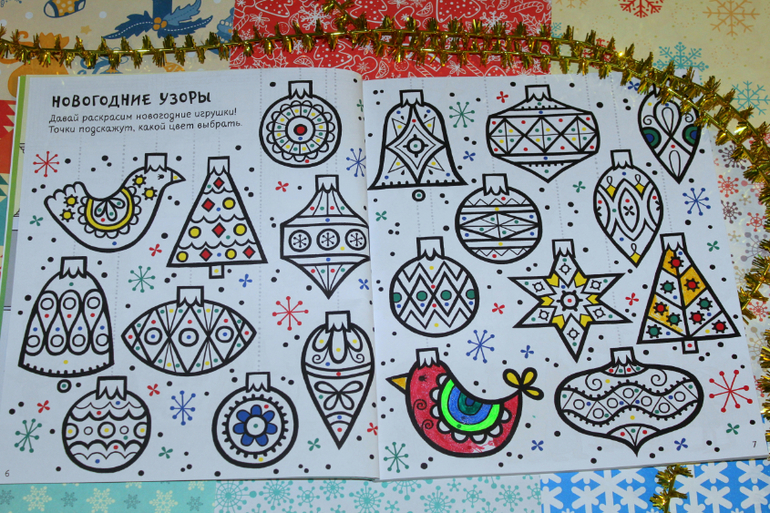 Предложила ей цветную бумагу, но пока её это что-то не вдохновляет. Она вовсю продолжает делать поделки из тетради! Отщелкала для вас содержание. Настёна сделала гирлянду, вырезала две маски, вот только я забываю купить резиночки для них, еще она сделала несколько подвесных звёздочек, игрушки конусы и в процессе шарики и объемная снежинка. Радует разнообразие новогодних принтов на заготовках, понравилось, что почти все поделки дочка смогла сделать самостоятельно и просто отлично, что занятий ребёнку хватает на несколько дней! Тетрадь получает от меня высший балл! 👍