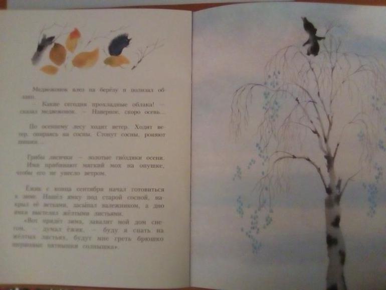 А во-вторых, такая... Ну, я не знаю как это объяснить. Я, когда её только получила, открыла на первом попавшемся месте и прочитала: "Медвежонок влез на березу и полизал облако. "Какие сегодня прохладные облака!" - сказал медвежонок. - "Наверное, скоро осень..." А за окном в это время был как раз холодный, серый, осенний день. И казалось, что облака действительно холодные. И я поняла, что эта книжка без сюжета станет одной из моих любимых. Да, сюжета нет, просто отрывочные фразы, предложения, но они такие, что хочется их цитировать и цитировать.