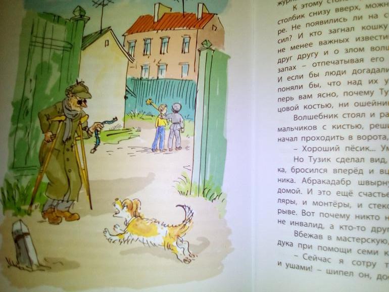Четвертая сказка "Кукольная комедия" тоже довольно интересная, правда, я так и не поняла почему она названа комедией - смешного в ней ничего нет, она, скорее, даже грустная. В городе "орудует" волшебник Могэс. Он превращает плохих людей в кукол. как ни странно, "могэс" - это сокращение от "московская государственная электрическая станция". Почему у волшебника такое странное имя - не совсем понятно, возможно, чтобы беспрепятственно проникать в квартиры, как он и сделал, попав в квартиру главной героини Таты и превратив в куклу её вредную соседку девочку Лилю. Кстати, именно читая эту сказку, мне пришлось объяснять детям что такое коммунальные квартиры. В ходе повествования Тата очень сильно заболела, и три куклы - бывший повар Петр Петрович, бывшая управдом Алла Павловна и Лиля отправились за волшебным лекарством. В финале за то, что они исправились, Могэс их расколдовывает и они снова становятся обычными людьми. Больше всего удивляла мама Таты - у дочери температура 40, она практически при смерти, а мама появляется, охает, меняет компресс и снова куда-то уходит. Мне кажется, я бы не смогла ребенка в таком состоянии оставить одного.