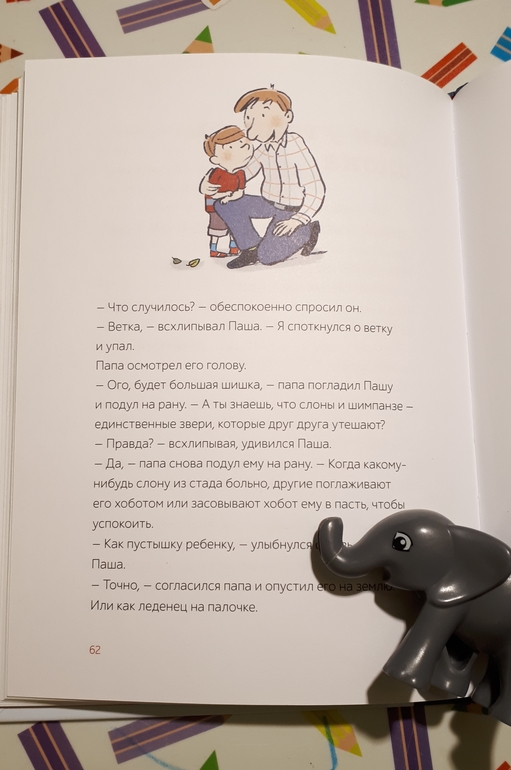 Очень трогательный рассказ «Как утешить слона». Охотясь в кустах на слонов, Паша упал и разбил лоб. Что сделал папа? Он не стал говорить: "Ну, что ноешь, настоящие мальчики не рыдают!" Нет, папа взял его на руки, подул на шишку, рассказал забавную историю про утешающих друг друга слонов и предложил пойти за леденцом.