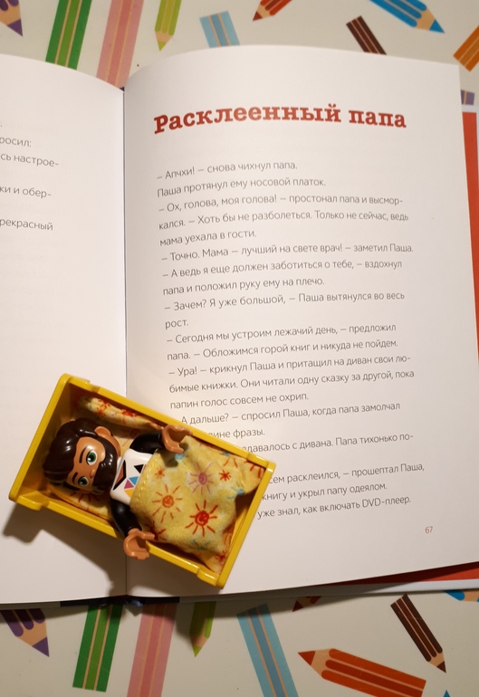 "Расклеенный папа" - отличный рассказ про эмпатию. Папа с Пашей остались дома вдвоем, но папа разболелся. И Паша трогательно заботится о "расклеенном" папе, понимая, что он плохо себя чувствует.