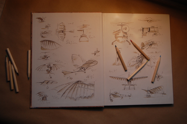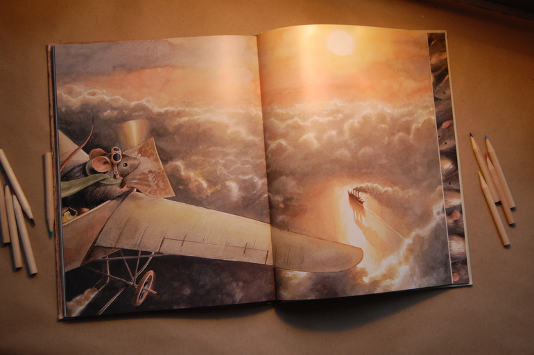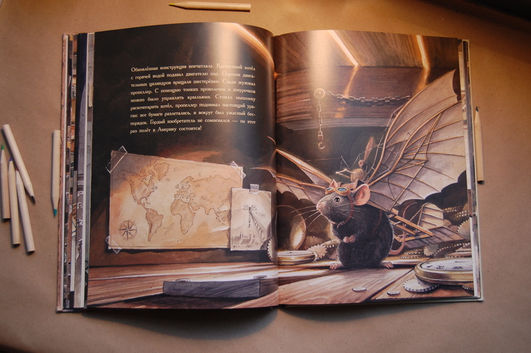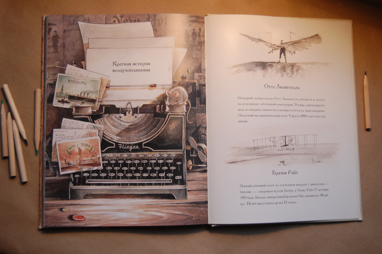 Книга потрясающая! Конечно, это иллюстрации! Это погружение в книгу, тебя захватывает и не отпускает...Ты видишь, насколько прорисована, прожита художником каждая деталь. Даже если бы я умела рисовать, я не нарисовала бы такую детальную красоту. Видно, что автор живет этим, это занимает его ум, немало времени он провел над историей воздухоплавания, чтобы создать эту книгу - это заражает тебя. За что я люблю такие книги - они побуждают к действию.. Они вытаскивают тебя из повседневной рутины и показывают, что жизнь многогранна, перед тобой открыто много дорог! Для детей это так важно, заложить в них дух исследования и познания...