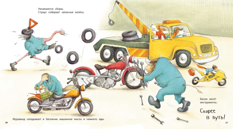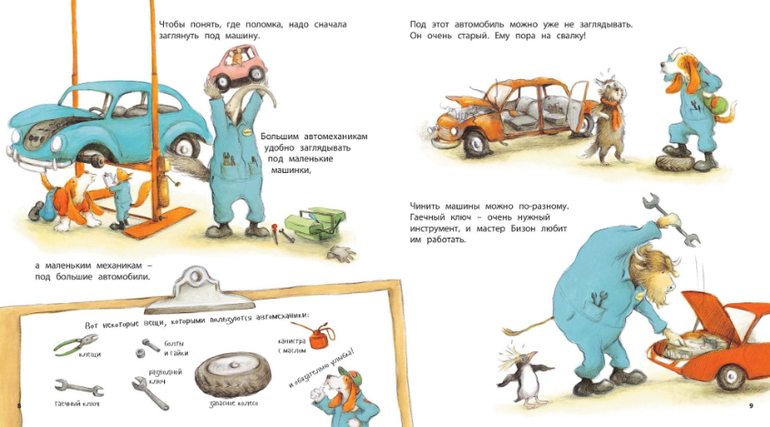 "Марк - весёлый маленький пёсик. Сегодня сбылась его мечта: он едет в автомастерскую. Там он будет во всём помогать своему папе - автомеханику. Их ждёт очень много работы и самые разные машины: пассажирские автобусы, легковые автомобили и даже большие грузовики. Одни надо починить, другие - помыть, а третьи - покрасить.
