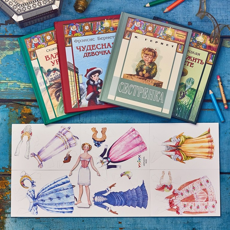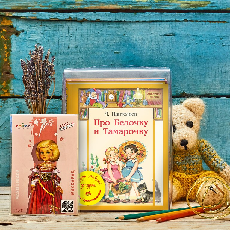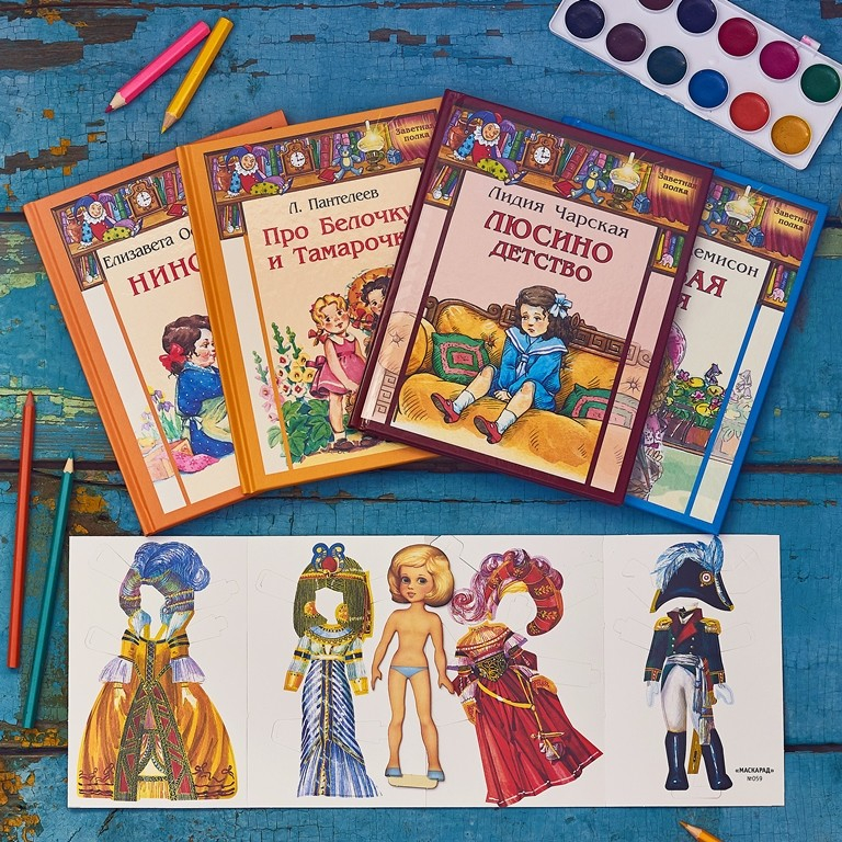 - Люсино детство (автор Чарская Л., художник Володькина Е.), а также кукла-наряжайка «Маскарад» (кукла из плотного картона плюс шесть нарядов и шесть раскрасок - заготовок для нарядов).