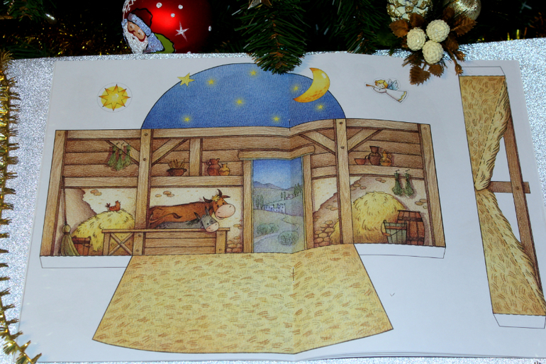 Качество у книги отличное, плотный офсет, 24 станицы. Листы используемые для вертепа расположены посередине книги, их можно аккуратно достать отогнув скрепки. Книга останется цела, что для меня всегда играет большую роль.)