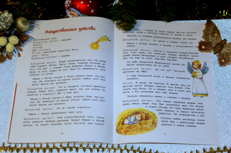В книге мы встретились с бродячим артистом. Он везде носит с собой домик-ящик. Внутри этого ящика звенят колокольчики, приглашая всех посмотреть представление. Артист легко один справляется со всеми героями. Но пока они спрятаны за занавеской, а артист рассказывает нам историю появления домика-ящика. Называется этот ящик старинным словом "вертеп". Вертеп - это пещера, в которой родился Христос. Первый вертеп появился на свет более тысячи лет назад! В России учёные обнаружили вертеп датированный 1591 годом! Люди любили эти представления, поэтому артисты стали давать спектакли до самой Масленицы, а позже даже летом приезжали на Нижегородскую ярмарку, самую большую на тот момент в Российской империи!