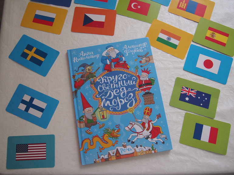 В январе Леша нашел мою заначку с карточной игрой «Флагомания» и теперь любит искать нужный флаг на карточке и в книге. Так что книга не только про Дедов Морозов, но для изучения названия стран и флагов нам пригодилась.