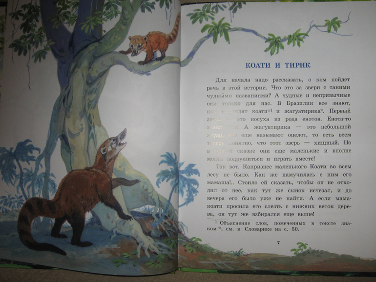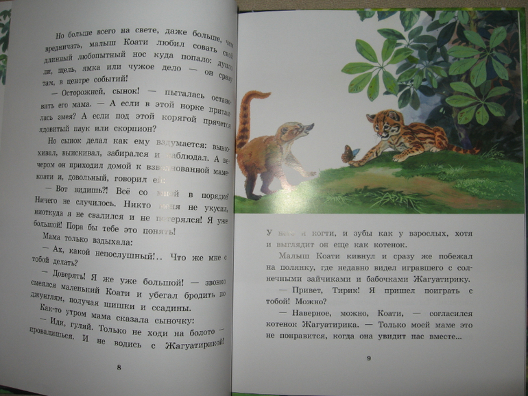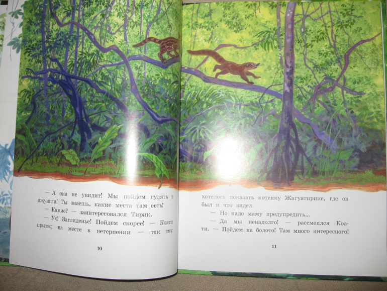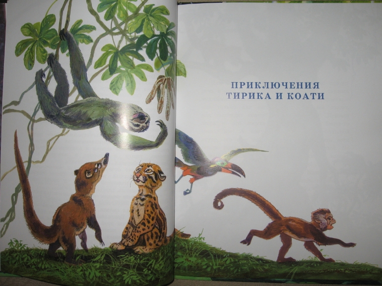 Сказок в книге всего три, но все интересные. Самая длинная и "переживательная" история о Тирике и Коати. Именно она привлекает Алису в книге, именно ее мы и перечитываем в основном, а две другие за компанию. Малыш Коати считает себя уже очень умным и очень взрослым. Таким умным и взрослым, что можно пренебрегать мамиными советами, наставлениями, предупреждениями. Он часто убегает гулять по джунглям в одиночестве, возвращается уже вечером, но однажды в путь он отправляется не один. Он прихватывает с собой в путешествие по джунглям нового друга - Тирика. Вдвоем-то они и попадут в такие переделки, что у Коати надолго пропадет желание не слушать маму. История заканчивается благополучно, иначе и быть не может.