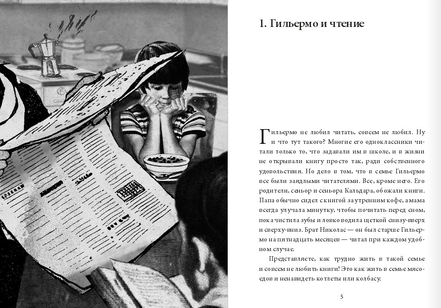 В семье Гильермо все были заядлыми читателями. Папа мальчика любил сидеть с книгой за утренним кофе, мама просто обожала читать перед сном, а старший брат Нико постоянно носил с собой какой-нибудь захватывающий приключенческий роман и читал при каждом удобном случае. И только один Гильермо не любил читать, совсем не любил. Что может быть скучнее, чем сидеть целый день с книгой? И какое еще удовольствие можно получить от чтения? Ведь на свете столько интересных игр и веселых занятий!