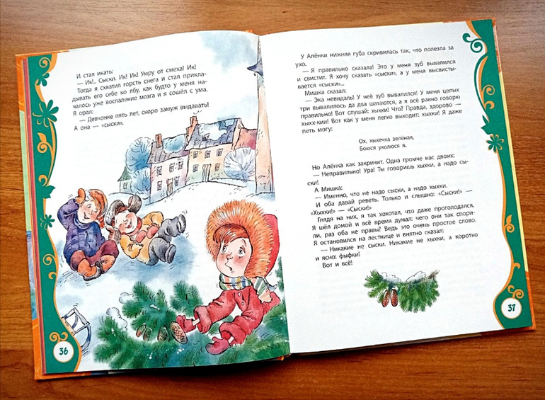 Сама книга у издательства Росмэн получилась достаточно ладная: твердый переплет, плотные страницы, хороший шрифт и милые рисунки, соответствующие тексту рассказов. Но! В книге есть разноцветные рамочки! Нас они совершенно не напрягали, мы их просто не замечали. Однако, есть люди, которые их очень не любят, поэтому книгу рекомендую тем, кто к ним спокойно относится.