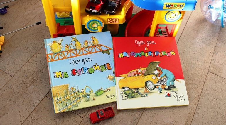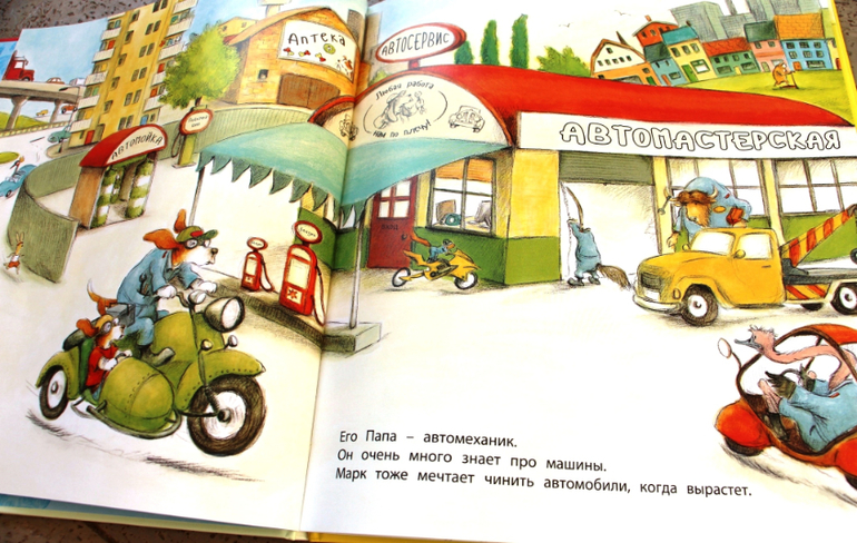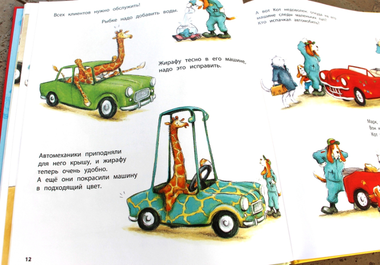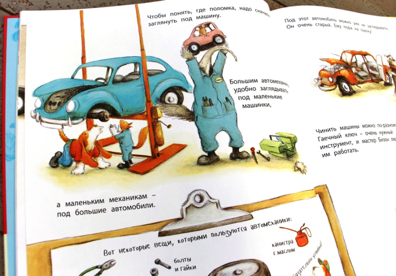 Книжки привычного формата - большой квадрат, иллюстрации содержат очень много деталей, текста достаточно много и он дает понимание об этапах стройки или работе автосервиса. И здесь не просто сведения по теме, здесь смешные истории.
