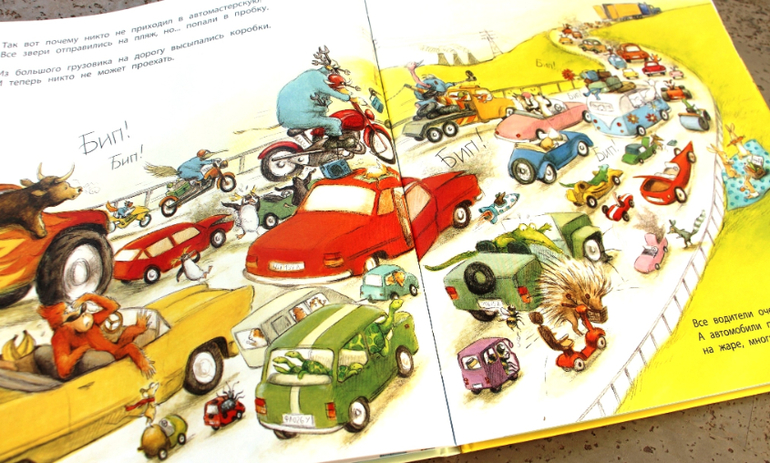 А в автосервис приехал вместе с папой-автомехаником малыш-щенок, который тоже не всегда к месту проявляет любопытство и «помогает» в работе. А потом механики починили кучу машин в рамках спасательной операции на шоссе и все поехали на пляж. Там на шоссе есть что рассматривать, у каждого машина по размеру и характеру.