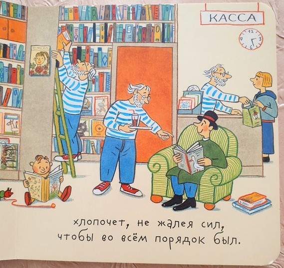 Художница постаралась на славу и мы видим не просто нейтральные образы книг, а узнаем обложки известных иностранных книг для детей.