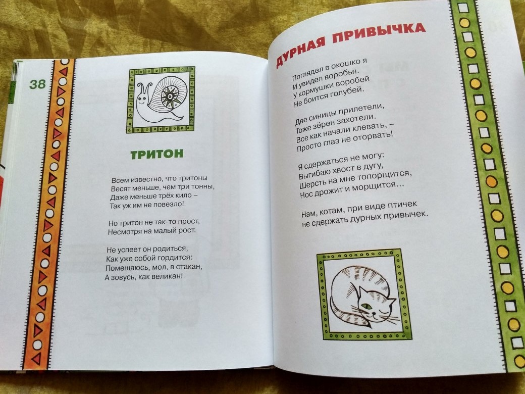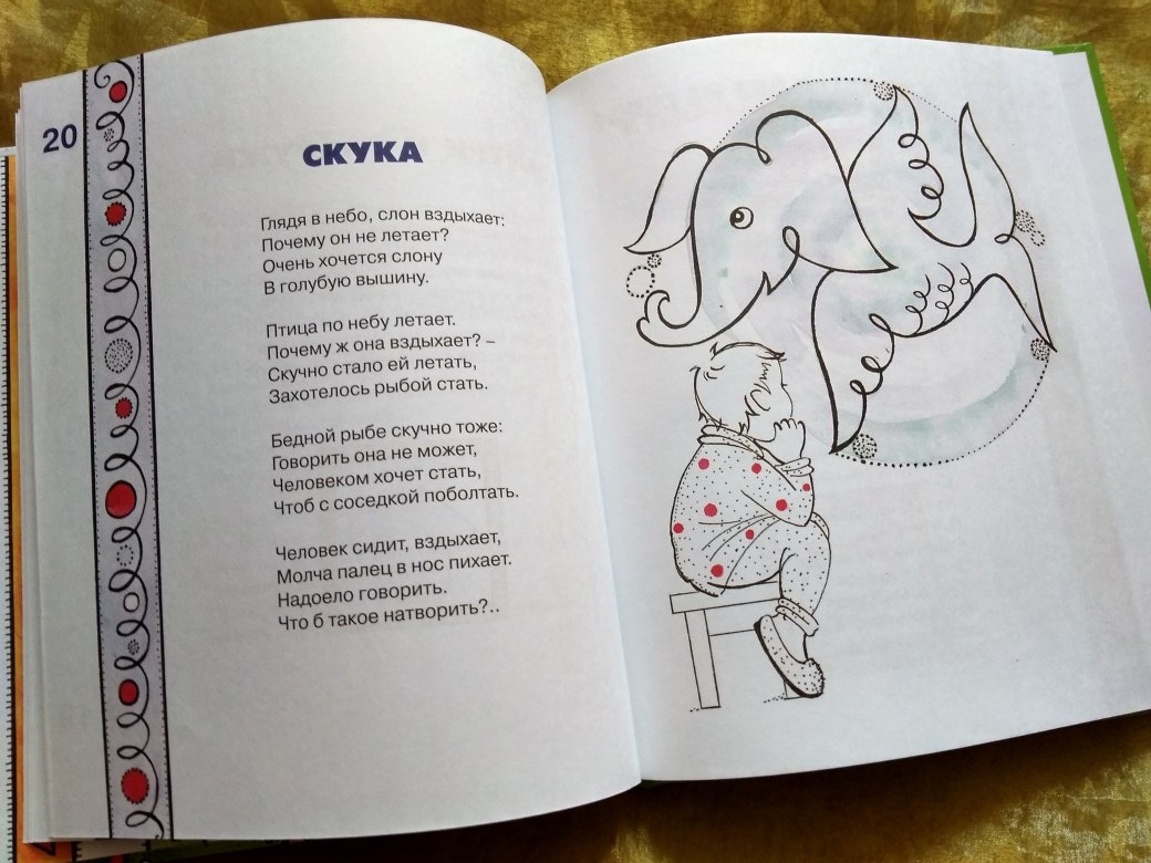 Быстро-быстро все пролистав, насладившись веселой нарядной пестротой, уже потом я спокойно рассматривала, перечитывала и радовалась каждому стихотворению, чуть ли не каждой строчке. Вообще, радость - это основная эмоция при виде этой книги. Пересечений со старой в ней ровно наполовину, что меня очень устраивает - и незнакомое есть, и знакомое зазвучало и заиграло совсем по-другому.