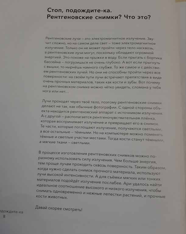 В книге рассказывается, что же такое ренген, для чего он нужен. Отдельно рассказывается, как у Ари ван т Рита появилась возможность сделать эти снимки. Ведь ренген - аппарат, который просто так не купишь в магазине.. а то мой сын решил, что ему тоже такое надо, будет кости людем проверять, тем более знает не понаслышке, уже был небольшой перелом ключицы🤦♀️ пришлось объяснять, что такое возможно только в больницах, и вообще что это не самое безвредное занятие .. но мы потом с этой книгой ходили в палеонтологический музей, и сын все таки решил, что лучше будет палеонтологом, кости раскапывать🤪