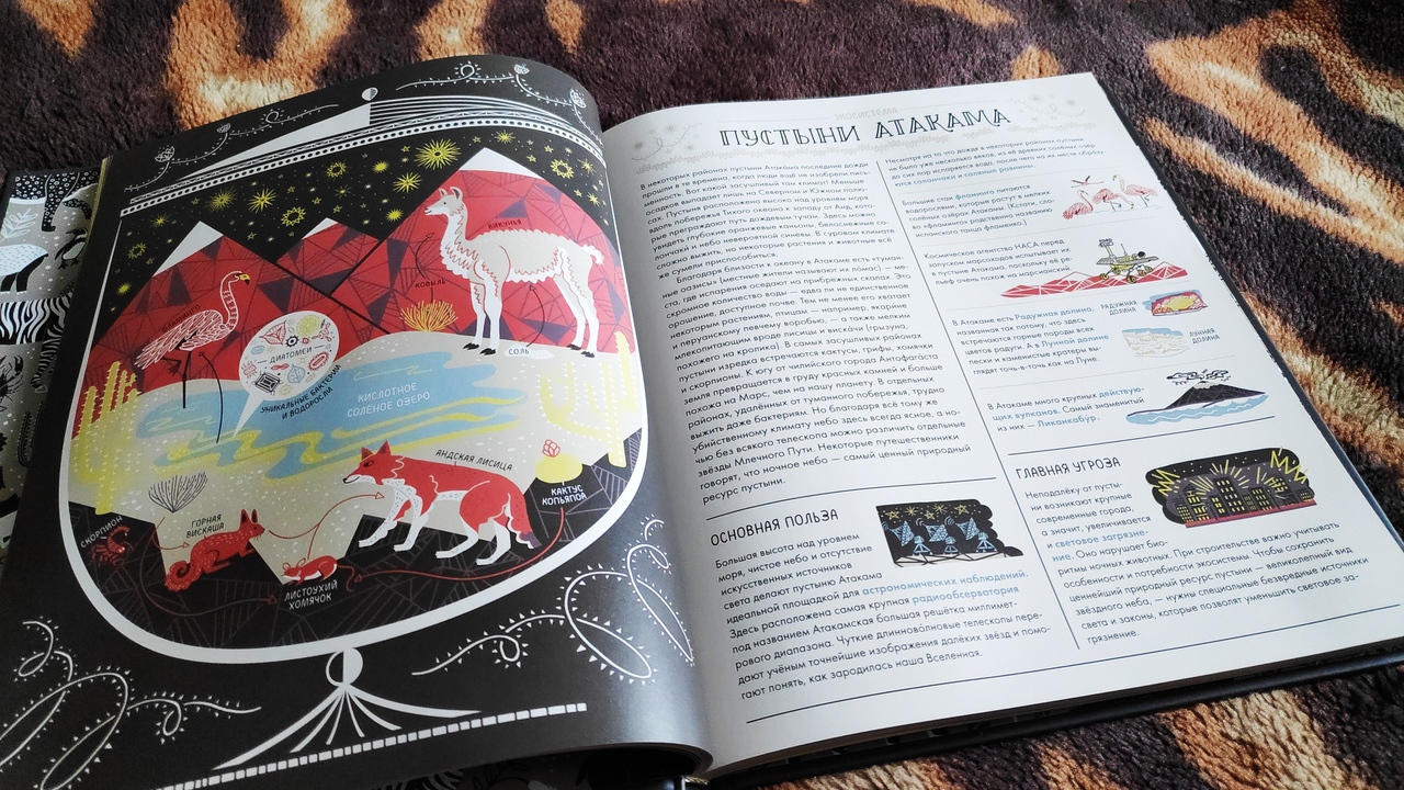 Рисунки с подписями, характеризующими каждую отдельную экосистему, были очень просты, информативны и наглядны. Начав смотреть книгу с середины, я сразу согласилась с нижней возрастной отметкой, выставленной издательством - 8 лет. Но при внимательном чтении эту планочку я бы подняла. Все-таки вводный текст, объясняющий суть того, что наука изучает, содержит термины, требующие дополнительных знаний. Подразумевается, что это все дается не на "чистый лист". По умолчанию считается, что ребенок уже имеет понятие о классификации, клетках, атомах, молекулах, процентах, что он знает такие слова как аномалия, катаклизм, ландшафт, знаком с названиями химических элементов. Получается так, что для понимания общей части в начале книги нужна более глубокая "научная" подготовленность. Поэтому, если вам что-то на нескольких первых страничках покажется сложноватым, не расстраивайтесь - дальше все будет гораздо проще и интересней! ))