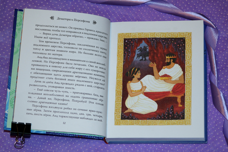 Когда люди были не грамотные, когда никто не знал ни про географию, ни про астрономию, когда люди не понимали, почему после дня наступает ночь, откуда берется ветер, дождь и гром, почему лето сменяется осенью, а потом наступает зима - всё это было странно и даже пугало, одни люди придумывали объяснения всему непонятному, а другие верили и передавали из уст в уста, из поколения в поколение. Объяснения эти весьма оригинальные, фантазия у людей была бурная.)) Например, начинается книга с печального объяснения времен года. Аид, бог подземного мира, похитил прекрасную Персефонию. Её мать Деметра - богиня плодородия, не могла смириться с потерей любимой дочери. Она перестала заботиться о земле, ничто больше не интересовало ее. Растения гибли, урожай пропадал, но Деметре было все равно. Всё заканчивается тем, что Персефона полгода стала жить в подземном царстве, а полгода с матерью. Как только Персефона покидает родительский дом и спускается в царство мертвых, Деметра перестает следить за землей, полгода она плачет и тоскует по своей доченьке, а на землю приходят осенние дожди и зимние холода. И все это повторяется и по сей день.) А вот почему Аид отпускает Персефону от себя на полгода, и почему Персефона каждый раз возвращается к нему, я рассказывать не стану, должна же остаться хоть какая-то тайна.) Про все мифы хочется рассказать хоть чуть-чуть, но так же хочется, чтобы вы сами прочли их, не зная, что ждет на следующей странице. Скажу лишь, что в мифах животные разговаривают с людьми, переодеваются в одежду людей, дружат и воюют. Боги, люди, животные - все общаются между собой, бывает даже так, что маленький паучок оказывается умнее бога и лесного духа. Но умолкаю, иначе так и раскрою вам все тайны и секреты древних народов.