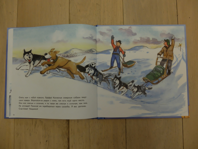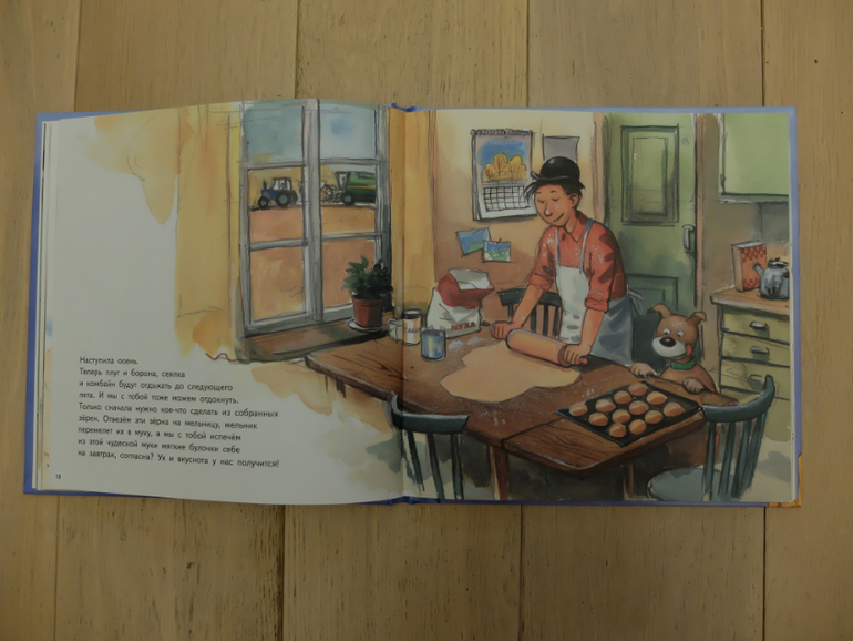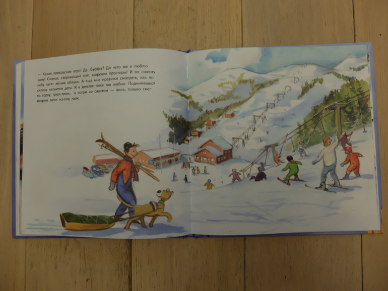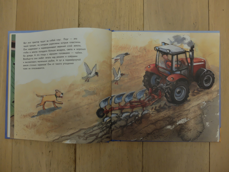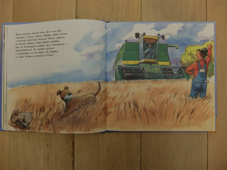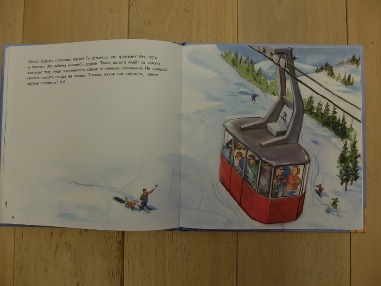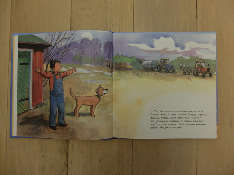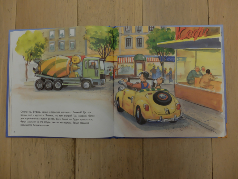 Что же касается книжки, то по формату она один в один, как Кастор и Лола с Бруно. Содержание разделено на три раздела: Машины в деревне, Машины в городе, Машины в горах. Итого 55 страниц. На каждом развороте большая картинка и совсем немного текста, около 4-8 строчек. Бумага офсет с отличной печатью, хотя страницы на ощупь чуточку тоньше Кастора. Моей дочери книжка ооочень понравилась. При том, что она сейчас с огромным удовольствием слушает Мышку Тильду Яблочное семечко по многу глав за раз, эта книга тоже пошла на ура. Наверное еще и потому, что обожает Буффу:) Для нас самый интересный раздел был про горные машины, на втором месте сельхоз, на третьем - городские.