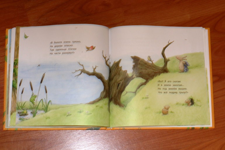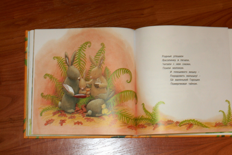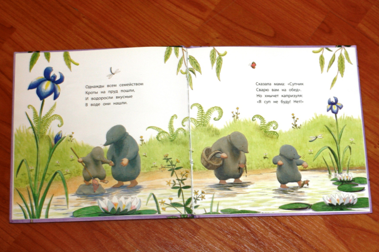 Мне почему-то редко попадаются книги-картинки с хорошим шрифтом на белом фоне. У меня жесткие требования к книге по части "гигиены зрения". Как это ни странно, даже там где несколько строчек текста на разворот, шрифт при этом не такой уж крупный, или фон темный и шрифт сливается с фоном, или сам шрифт нетрадиционный, с вкраплением письменных букв и всяких вензелей, или не ровные строки, а волнистые, диагональные. И.т.п.